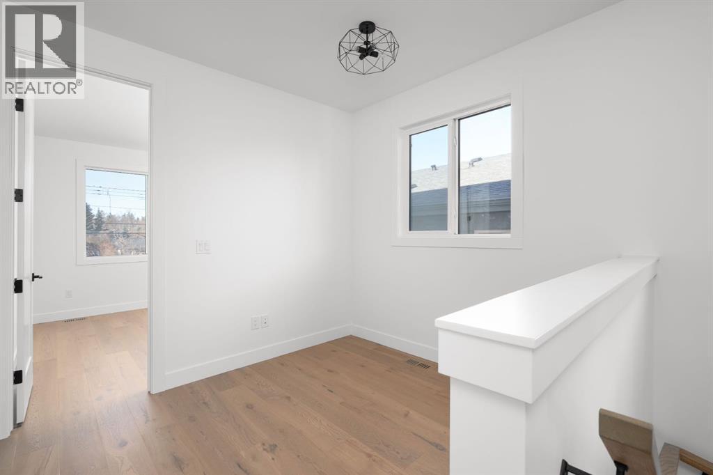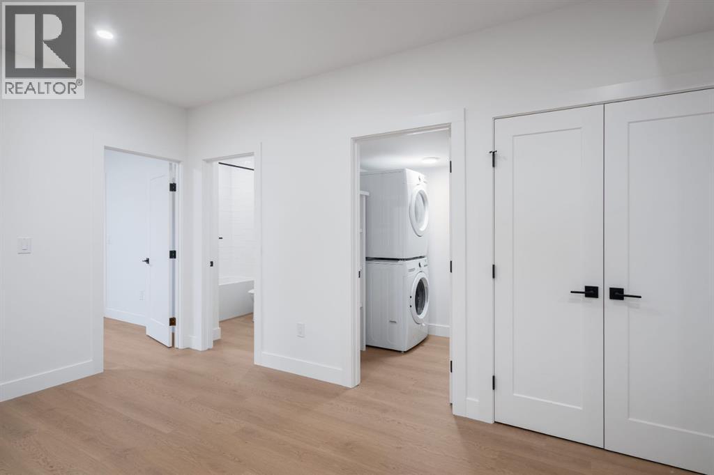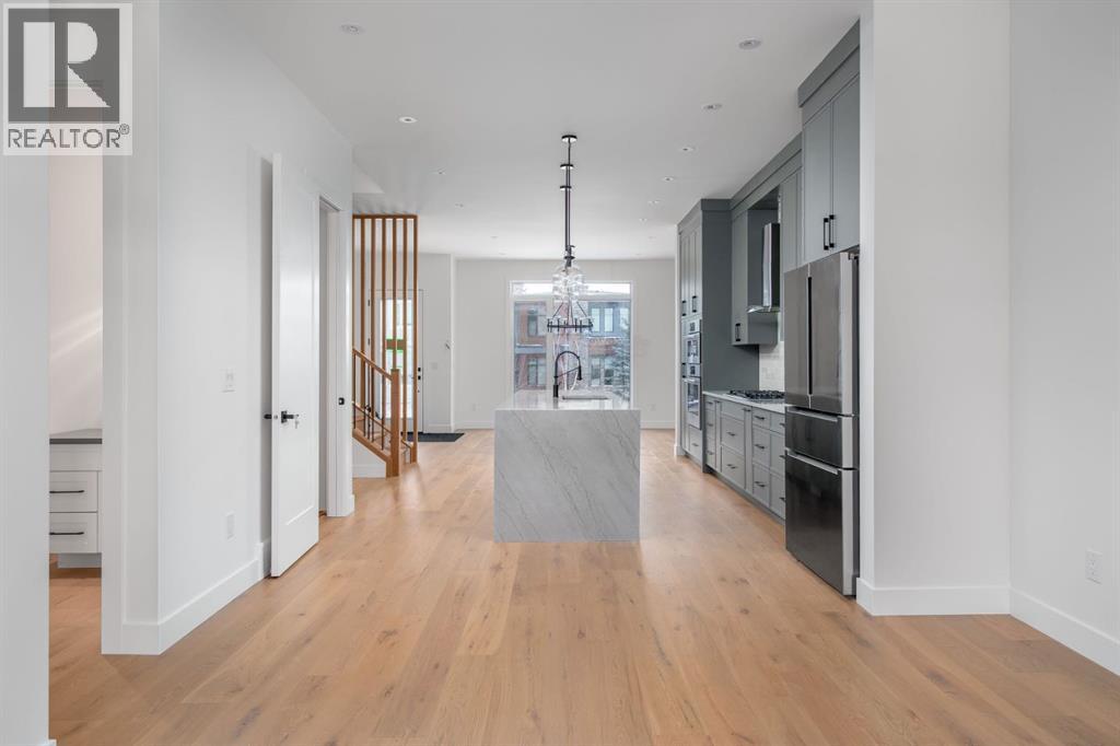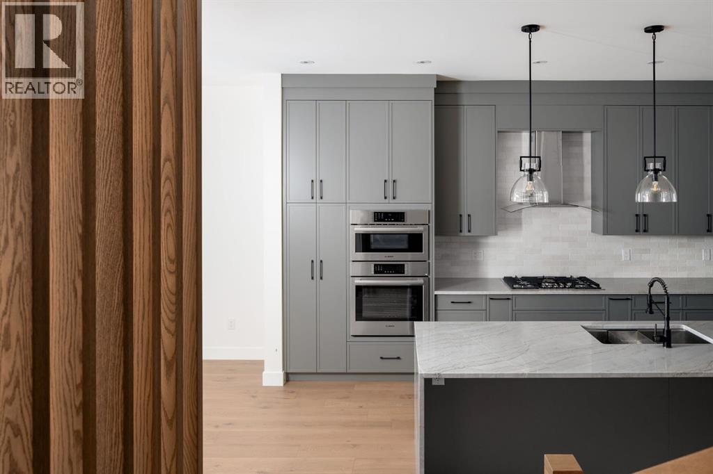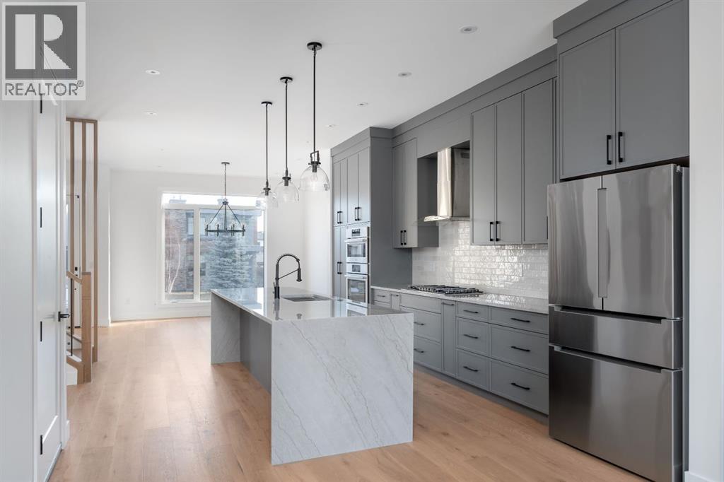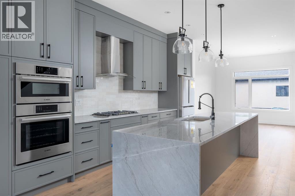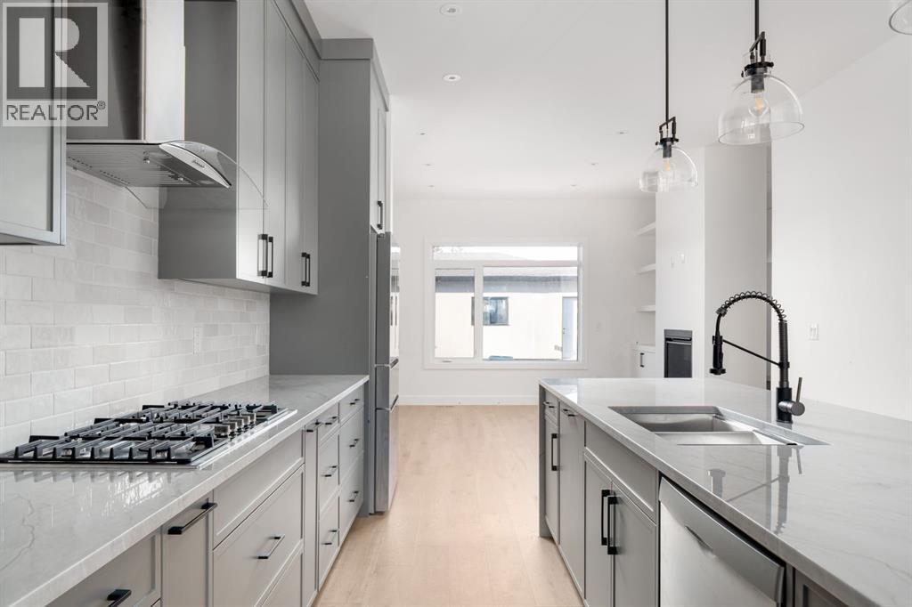 **Open House Saturday March 7th from 12:00pm-3:00pm** Welcome to The Killarney Collection in SW Calgary—thoughtfully crafted on a quiet street, this fully upgraded duplex infill offers a refined balance of scale, texture, and modern comfort. From the moment you arrive, the home makes a striking first impression with its sleek, contemporary exterior, pairing oversized triple-pane windows for abundant natural light with warm natural tones of metal cladding, stucco accents, and brick detailing.Inside, 10-foot main floor ceilings create a grand sense of arrival, setting the tone for the interior designer–curated colour palette carried throughout the home. Every detail has been intentionally explored, with the heart of the main floor anchored by a chef-inspired gourmet kitchen. Featuring a premium Bosch appliance package, fully custom-painted cabinetry, and an oversized waterfall granite island, the space effortlessly blends luxury with everyday functionality. A dedicated front dining room offers a warm setting for gatherings, while the rear living room provides a more intimate retreat, centered around a full feature-wall gas fireplace—perfect for evenings spent unwinding. Thoughtful storage solutions are seamlessly integrated, including built-ins at the entry and a fully custom mudroom at the rear, ensuring every inch of space is maximized. Ascending to the upper level, subtle design moments continue to impress, with a full wood feature wall, custom stair lighting, and luxury wide-plank hardwood flooring flowing continuously throughout both the main and upper levels for a seamless transition.The oversized primary bedroom is a true sanctuary, showcasing a vaulted and peaked ceiling design with expansive windows that welcome morning light. The spa-inspired ensuite features a dual vanity, an expansive full-tile shower, and a calming, private retreat. Two additional bedrooms offer generous proportions, each complete with custom closet built-ins. The upper-level laundry roo m maintains the home’s commitment to efficiency and design, offering full cabinetry, a folding counter, side-by-side washer and dryer, and a laundry sink. A versatile work-from-home alcove completes the upper floor, easily functioning as a den or secondary living space.The lower level further extends the home’s flexibility with an oversized 2-bedroom, 1-bath legal suite, centered around a spacious open kitchen—ideal for rental income, guests, or multi-generational living. A separate full laundry room, understair storage, and built-ins throughout each closet ensure the same level of thoughtful design continues below.Perfectly positioned close to inner-city Calgary, recreation centres, shopping, and public transit, this Killarney residence offers a timeless blend of form and function—designed to live beautifully today and adapt effortlessly for tomorrow. (id:47421)