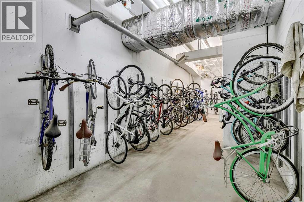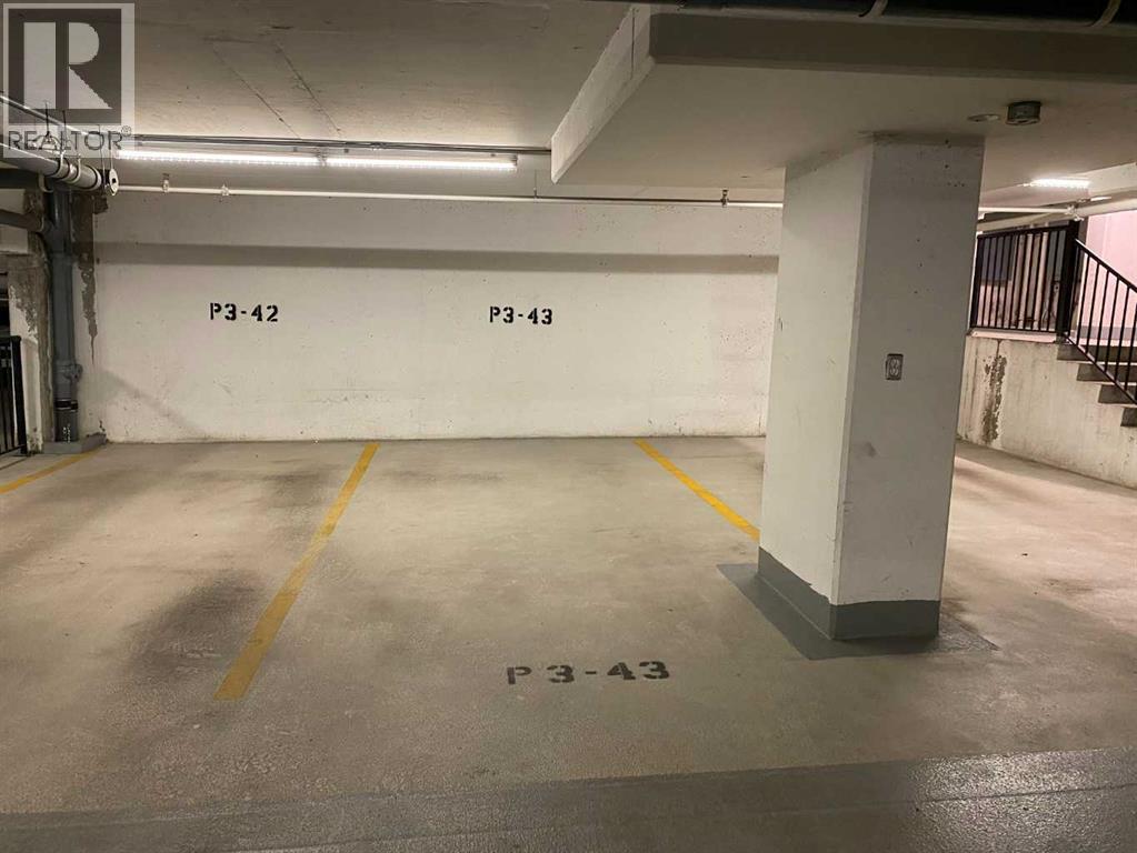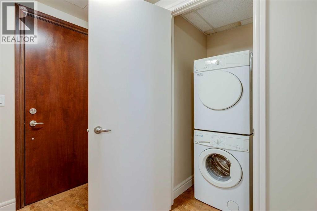 Why not take a look? This larger 1 bedroom unit will keep you safe & sound downtown in a prestigious building with concierge services and amenities. This unit offers a spacious entry featuring a double closet for outerwear, cushioning cork flooring with superior thermal & acoustic insulation, and a private DEN to write your next book or relax before heading out into the vibrant city. The full kitchen has a timeless design including a sophisticated glass panel cabinet to highlight special glassware, storage pantry, undermount lighting as well as recessed electrical outlets. ALL appliances are still like new having been rarely used – as well as washer/dryer. [Owners did not live here fulltime but used the space for stop-overs in Calgary. They appreciated the security in this ideal location just steps away from shopping and within walking distance to sports & Stampede] Inviting living room is open concept & full balcony spans across the living room and bedroom with glimpses of the sky north & south. The bedroom is almost 12’x12’ with deep double closets & full of natural light. A traditional 4-pce bathroom has plenty of space and this unit also offers multiple storage closets as well as EXTRA separate storage in the parking garage. You will appreciate Central A/C & 3 elevators within the building as well as thoughtfully designed stairwells. Titled parking is included & pets are welcome with approval. (id:47421)